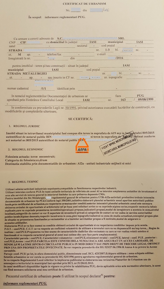 Terenul are deschidere la str. Metalurgiei si este pretabil pentru constructii industriale , certificat de urbanism – conform PUZ:  ( AI2a- unitati industriale mijlocii si mici ).